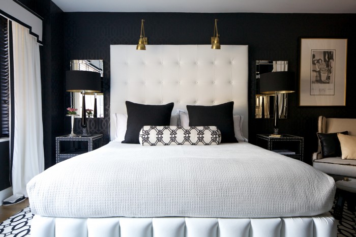 Is this not the sexiest bedroom you've ever seen!? All it's missing is a fur throw. Looooove that wallpaper. and the gold lighting. And the studded side tables. And the lamps with gold insides with mirrors behind to throw more sexy light around.
